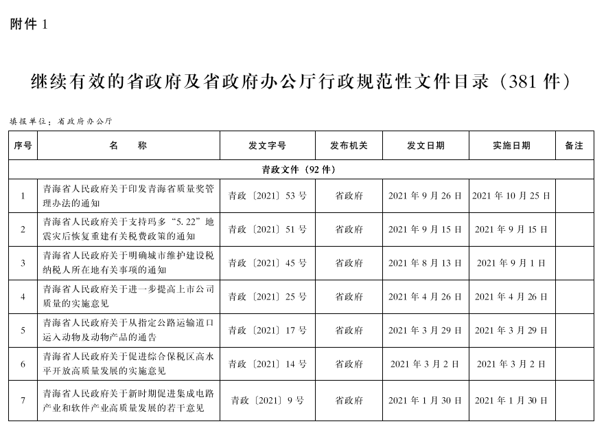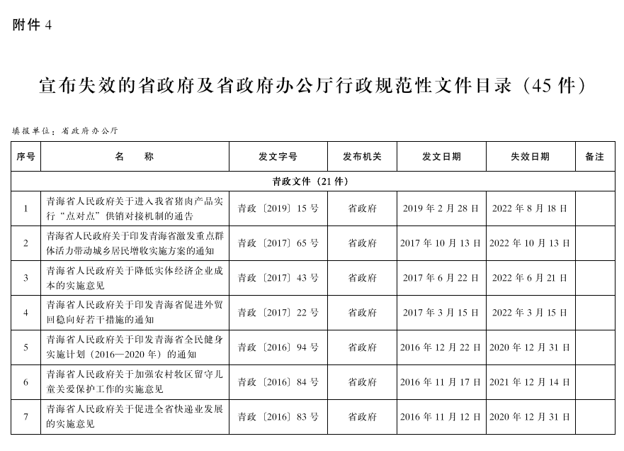 為深入推進(jìn)依法行政,深化行政體制改革,加快建設(shè)法治政府,加強(qiáng)行政規(guī)范性文件的監(jiān)督管理,根據(jù)《青海省行政規(guī)范性文件制定和備案辦法》(青海省人民政府第99號(hào)令)的相關(guān)規(guī)定,省政府以2020年清理結(jié)果為基數(shù),對(duì)2020年清理中繼續(xù)有效的規(guī)范性文件,以及2020年7月1日至2022年6月30日兩年來以省政府及省政府辦公廳名義印發(fā)實(shí)施的規(guī)范性文件進(jìn)行了清理,現(xiàn)將清理結(jié)果公布如下: